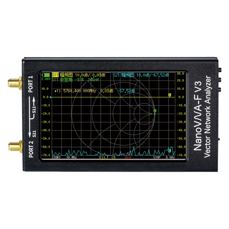 NanoVNA-F V3 is a Portable Vector Network Analyzer (VNA) with frequency range of 1MHz~6GHz. It can be used for S11 and S21 measurements. The S21 dynamic range of NanoVNA-F V3 is 65 dB, while the S11 dynamic range is 50 dB.