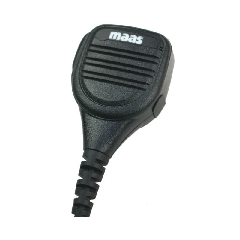 Robust speaker microphone with earphone connector (3.5 mm jack), spiral cable and swivel, sturdy clip.