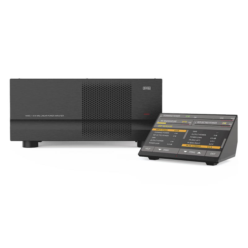 The ACOM 1400S is a state-of-the-art linear power amplifier that covers all amateur bands from 1.8 through 54 MHz and provides 1200 W output power (PEP or continuous carrier). The amplifier operating information is shown on a separate Remote Control Unit (RCU) equipped with a touch screen.
