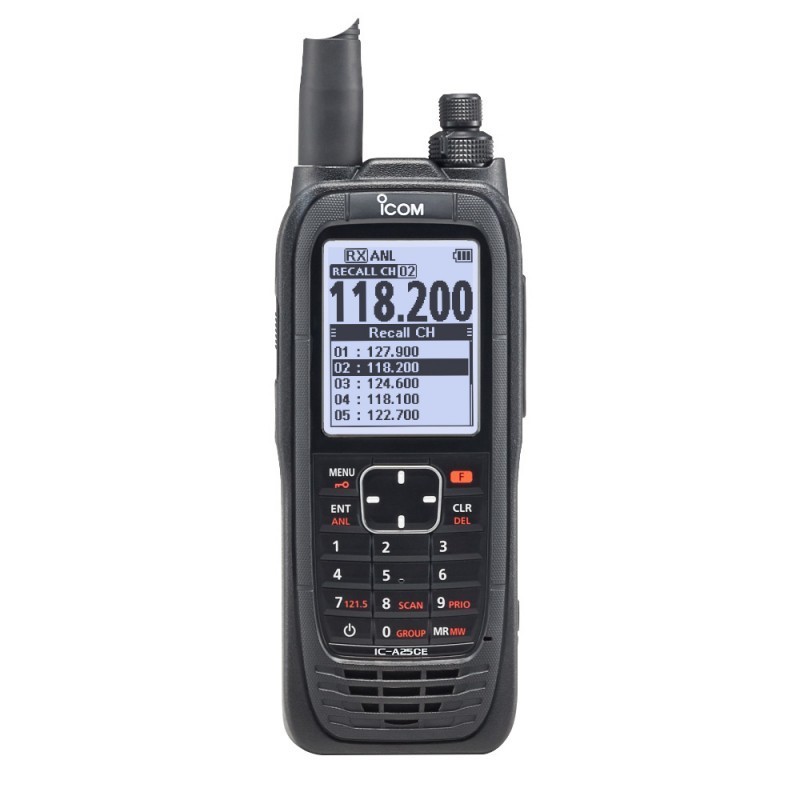 IC-A25CE stores the last used 10 channels. You can easily access channels by using the directional keys, channel knob, or keypad. This is suitable for switching between multiple channels, such as NAV (NE version) and COM channels. In addition, you can freely edit (replace, delete, reorder) the stored channels.
