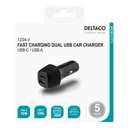 DELTACO 12/24 V USB car charger with dual USB ports and fast charging, 36 W, black