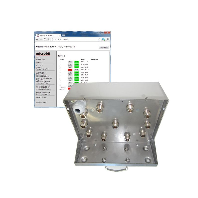 The switch is designed specially to be used for remote (over the Internet ) controlled systems, but can of course be used in other applications also. The switch can be manually controlled via an internal web interface. Together with Remoterig RRC-1258 it can be setup to automatically follow your band changes. The switch connects to the RRC over IP, no serial port is needed. Normally it is powered with 48V via the Ethernet cable according to the PoE standard. This means that the switch can be placed in a tower 100m from the schack. The switch is built in stainless steel and can be placed outdoor. It can be ordered with SO-239 with PTFE dielectric.