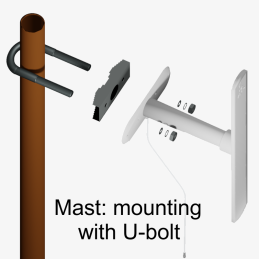 Levereras med plastfäste och monteringsdetaljer för enkel installation på mast eller vägg samt med 5 meter lågförlustkabel med SMA-hankontakt.