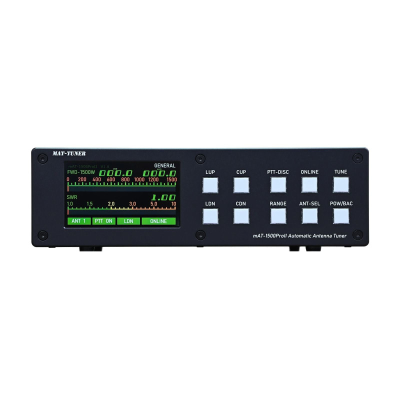 mAT-1500ProII är en mångsidig automatisk antenntuner som är avsedd för sändare och linjära förstärkare upp till 1500 watt (SSB) eller 800 watt i digitalt läge. Den arbetar inom frekvensområdet 1,8 till 30 MHz och kan anpassa nästan alla koaxmatade antennsystem – oavsett om det är en dipol, vertikal eller yagi – även vid komplexa impedanser.
