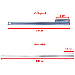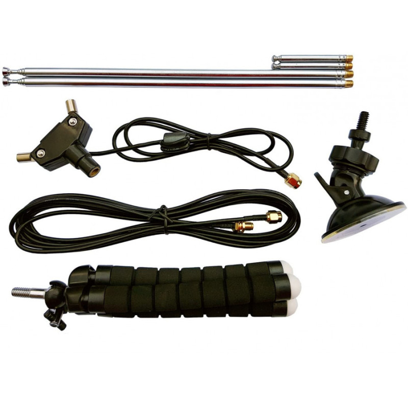 2x teleskopantenner, 23 cm till 1 m. De teleskopiska dipolerna kan tas loss från dipolbasen via en M5‑gänga, vilket ger bättre portabilitet och möjlighet att byta antenner. Dessa längre teleskopantenner täcker VHF‑ till UHF‑banden.