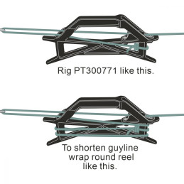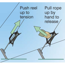 Vid användning rullas repet ut från rullen när masten förbereds för uppsättning. För att spänna, skjuts rullen helt enkelt upp längs staglinan – klämman greppar automatiskt repet. För att lossa, dras repet upp mot handtaget.