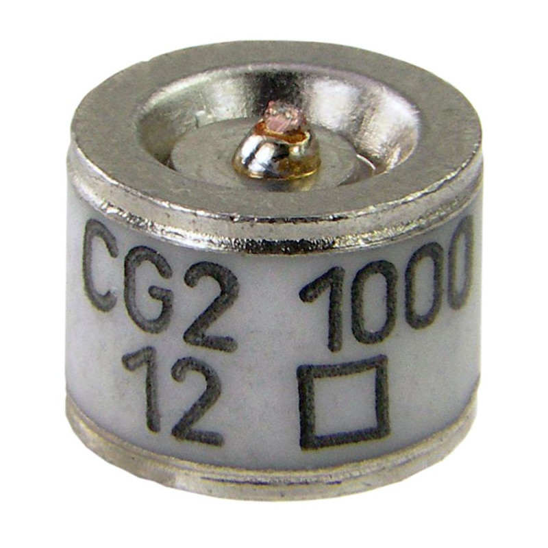 Gasurladdningsrör (GDT). Statisk brytspänning ca 1100 V, toppström 500 A, max kapacitans 1,5 pF, diameter 8,1 mm, längd 6,07 mm.