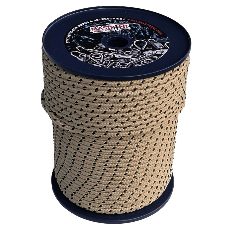 MASTRANT-C (kamouflageversionen av Mastrant-P, sandfärgad med bruna prickar) är en staglina optimerad för stagning med fokus på maximal "prestanda/pris"-kvot. Detta utmärkta rep erbjuder mycket god styrka, låg töjning, hög UV- och fuktresistens. Det har låg vikt, utmärkt nötningsbeständighet, lång hållbarhet och är icke-ledande (påverkar inte din antenn alls). Dessutom har det, till skillnad från rep tillverkade av aramidfibrer (Kevlar, Vectran, Technora, Twaron), en knutstyrka på cirka 60 %.